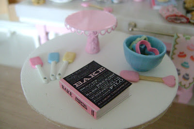 I've been happily busy filling orders and making new minis and wanted to share this adorable new cookbook I made... along with some happy colored baking supplies to go with it :o)